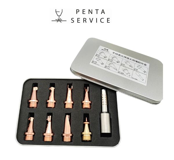 Комплект сопел для лазерной сварки, совместим и применяется в лазерных пистолетах SUP (CQWY), моделей SUP20S, SUP21S, SUP21T, SUP23T и других. Сопла также адаптированы для применения в сварочных пистолетах других производителей, использующих аналогичные габаритные размеры сопел. Сопла служат для обеспечения соосности излучения и струи газа. Обычно такой процесс применяется для сварки листов средней и большой толщины, когда требуется заполнение сварного шва дополнительным присадочным материалом.